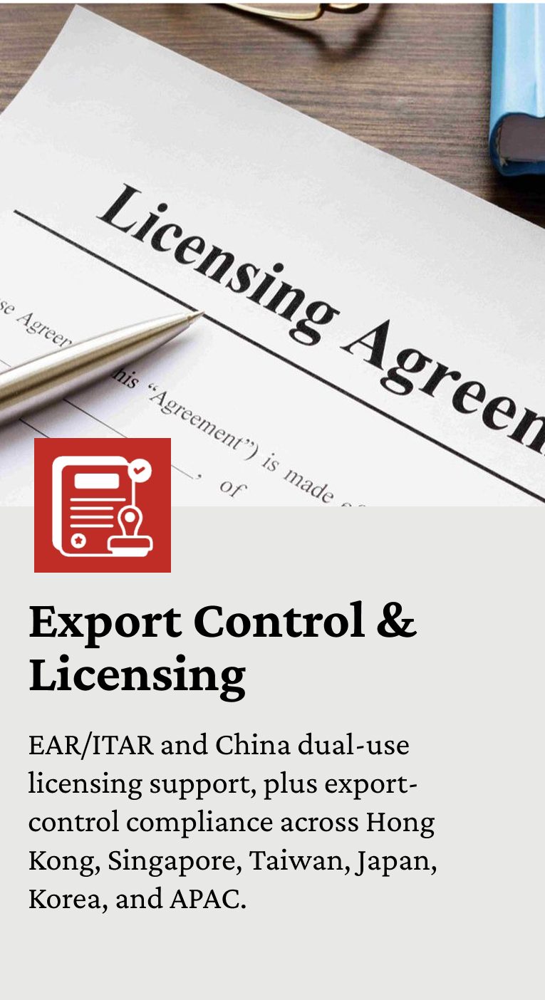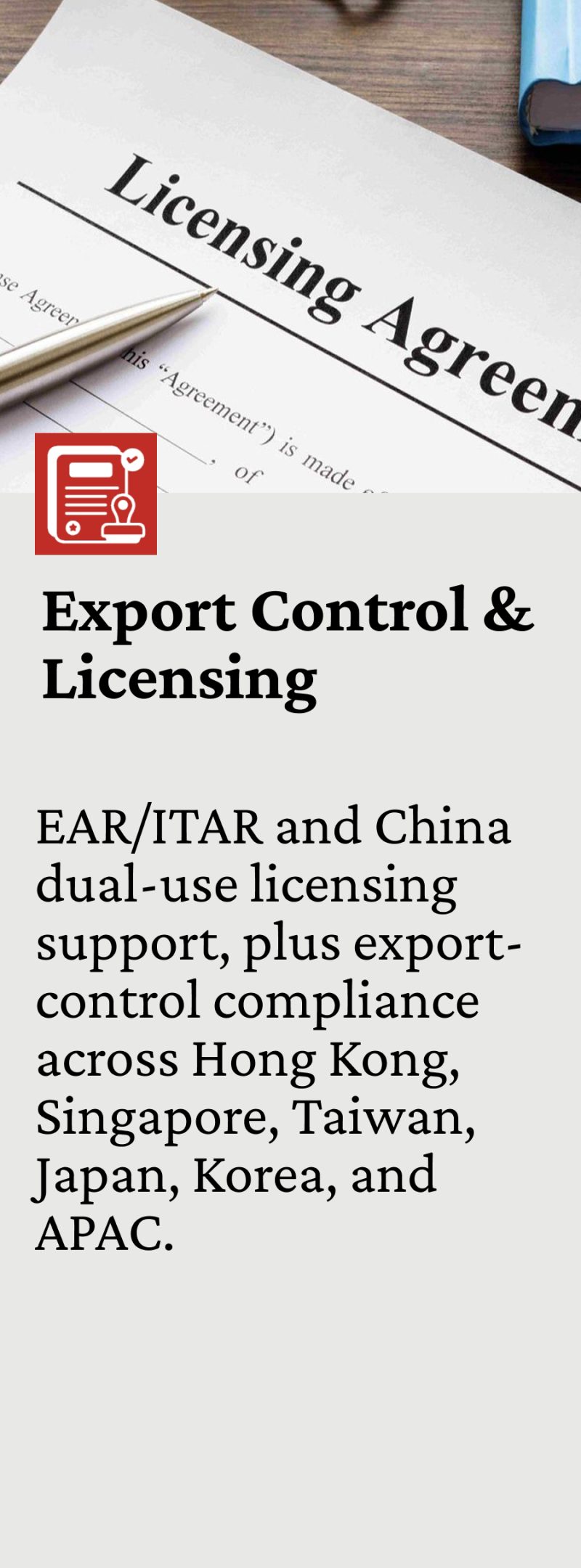 We focus on dual-use technology sectors with complex U.S.-China compliance requirements including semiconductors, aerospace & defense, scientific instrumentation, AI & quantum computing, telecommunications, medical devices, robotics, energy storage, critical minerals, photonics, and industrial automation.